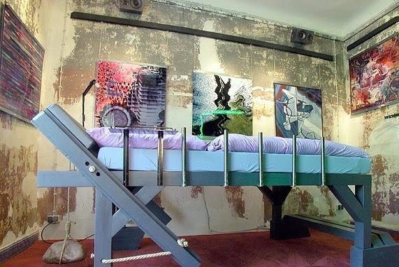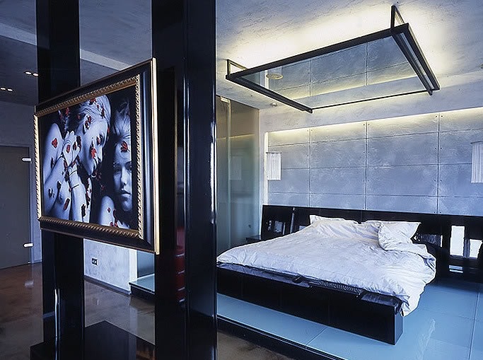 Sa vedem primul dormitor. Cu siguranta nu multi ar dormi intr-un astfel de pat. Dar fiindca gusturile nu se discuta trebuie sa recunoastem ca fiind interesanta ideea de amenajare a acestui dormitor.