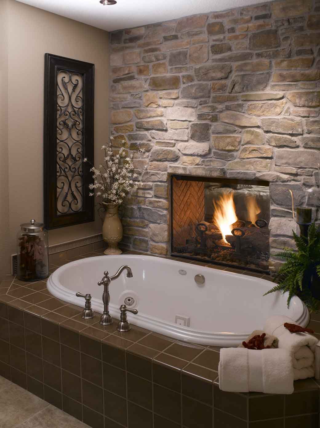 Iata o frumoasa baie unde piatra placata pe perete face senzatie alaturi de un semineu modern.