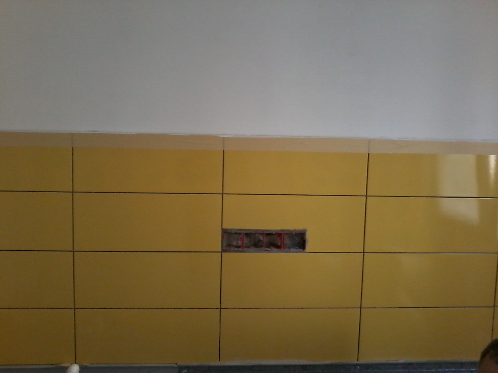 Faianta de culoare galbena are dimensiunea de 50 pe 20 cm si grosimea de 8 mm. Deci este o faianta de calitate. Placarea s-a facut doar in dreptul blatului, in restul bucatariei ramanand peretii doar gletuiti.