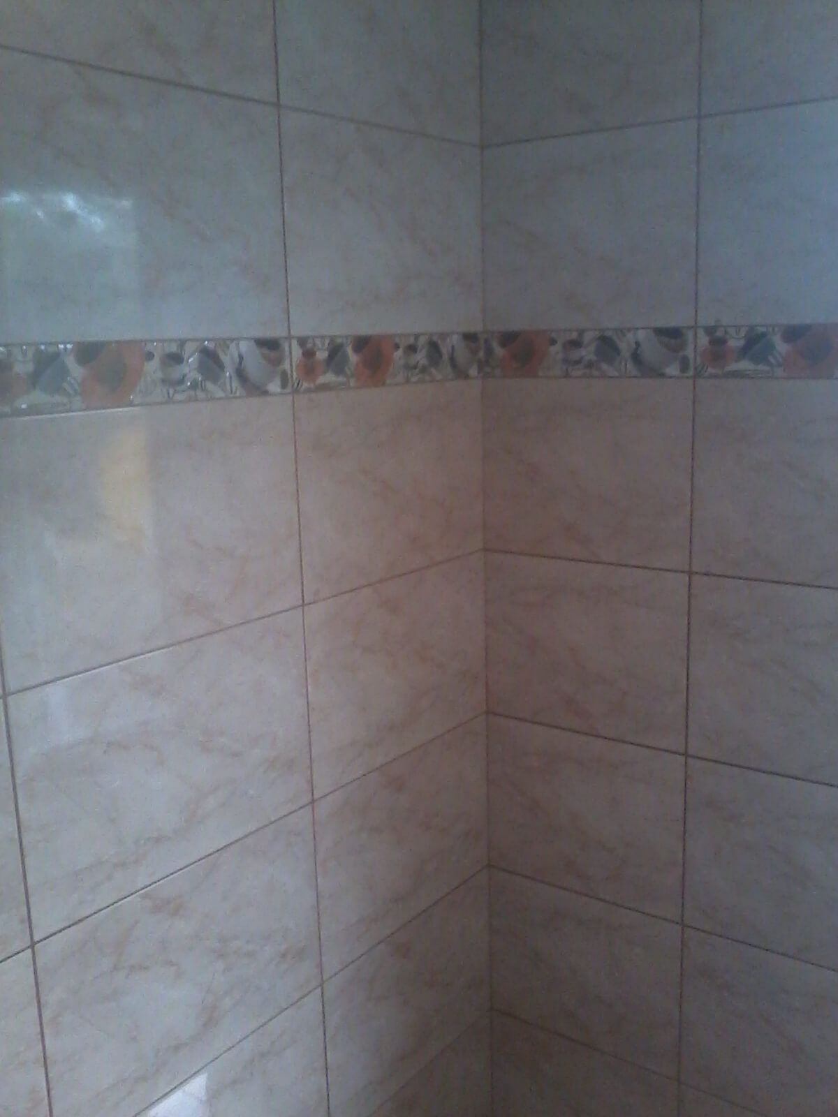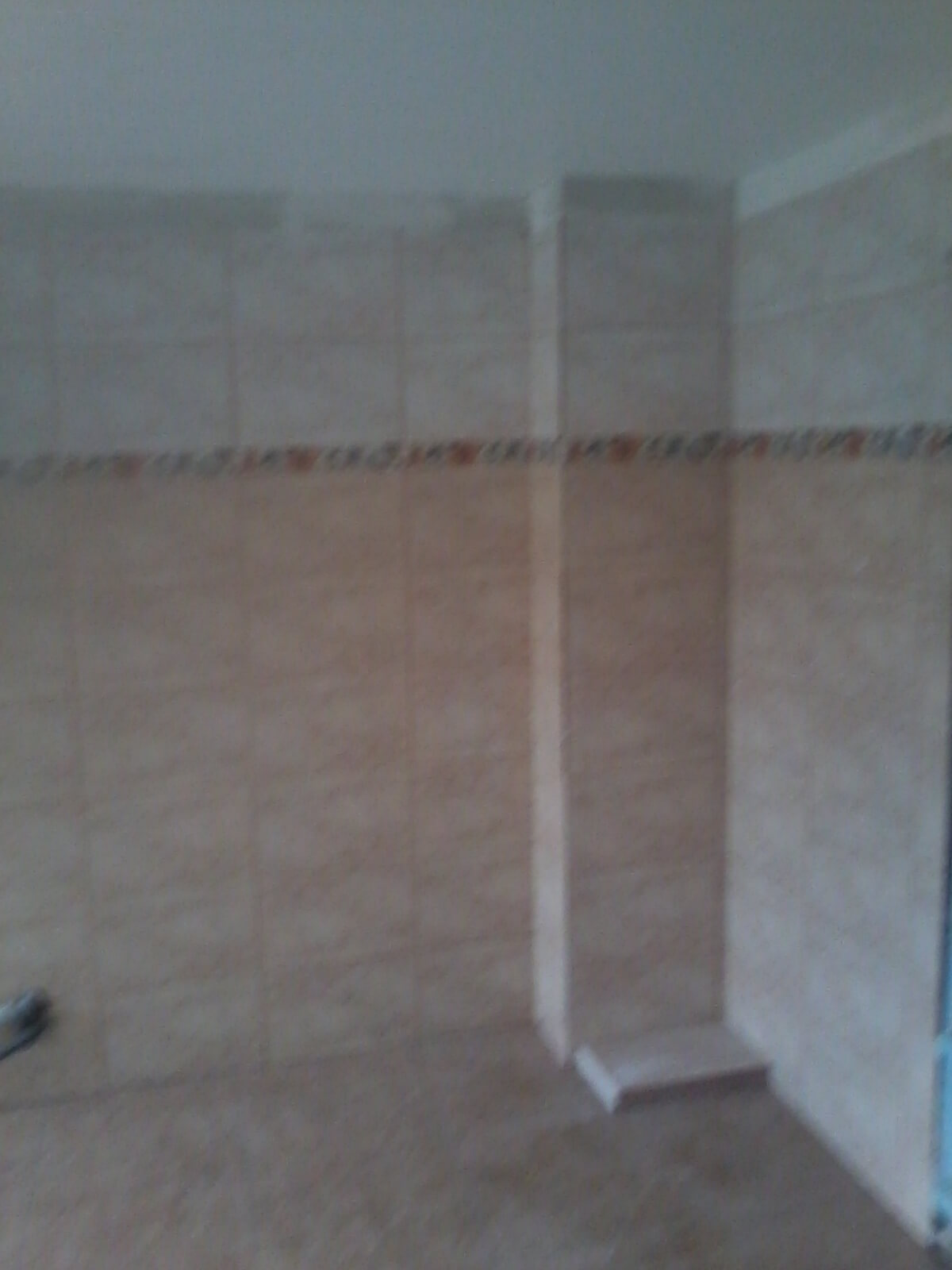 Intre tavanul din lambriu din PVC si faianta a mai ramas un spatiu de 10 cm care a fost gletuit si dat cu var lavabil.