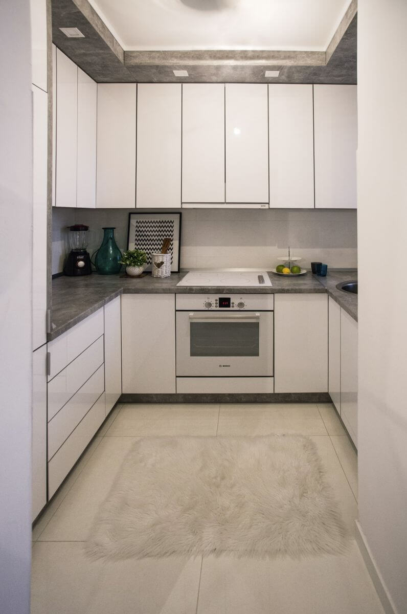 Bucataria este mica si moderna, cu mobilier fara manere. Dar ai vazut tu apartamente cu bucatarii mari? Nici eu 🙂